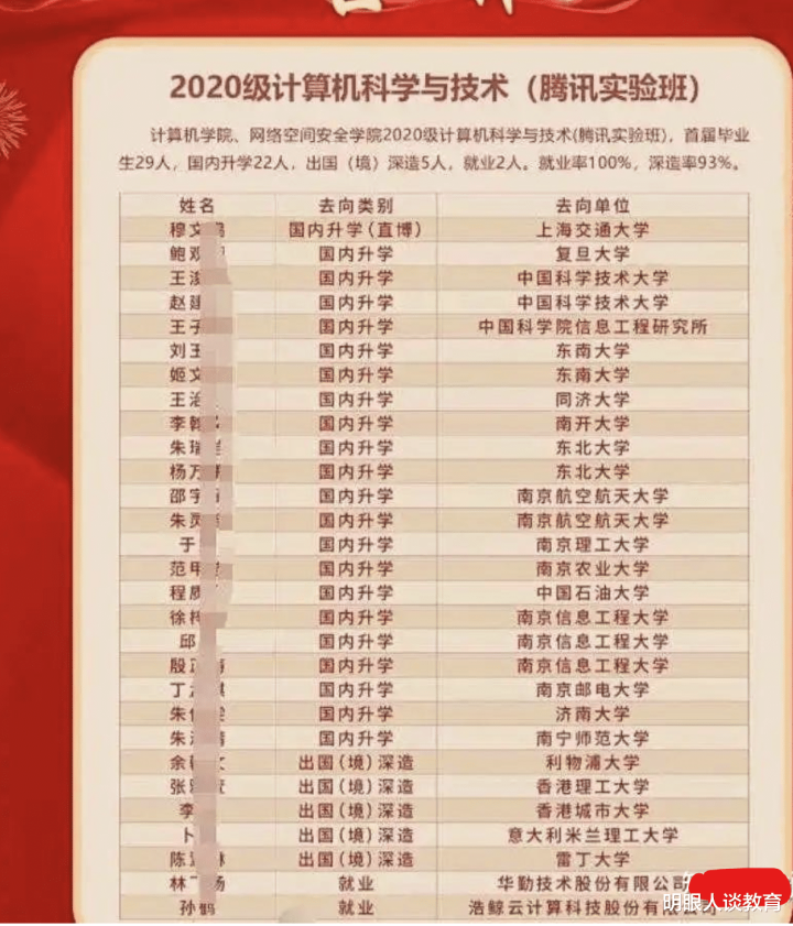 南京信息工程大学2020级计算机专业腾讯班毕业去向除了两人参加工作外,其余全部升学。令人意外的是,这个以互联网巨头腾讯命名的校企合作班级,全班毕业生中竟然没有一人成功入职腾讯公司。