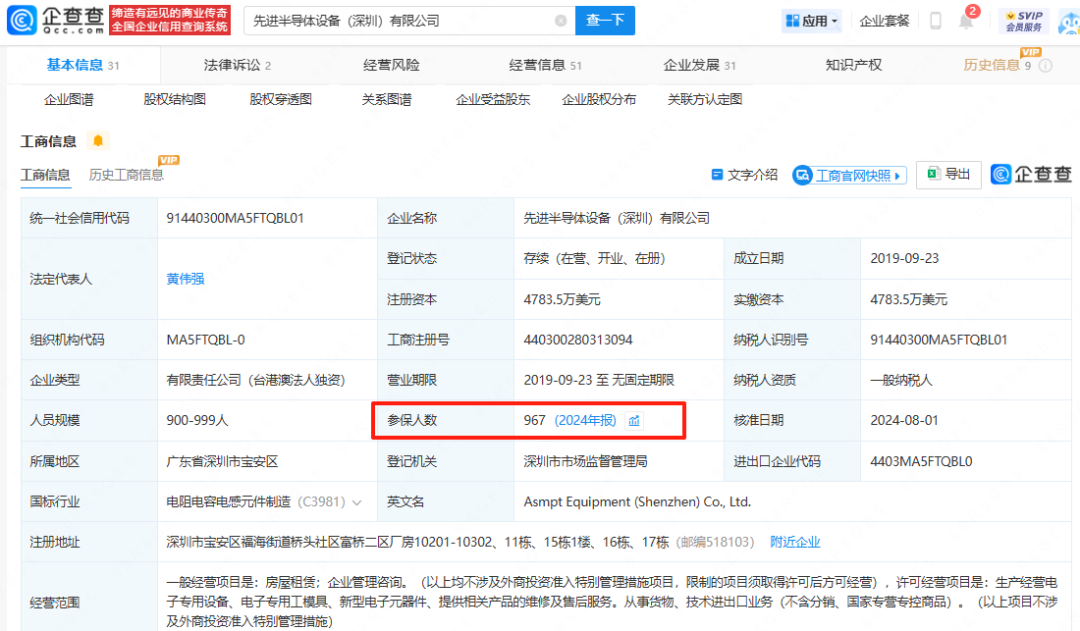 据企查查资料显示,先进半导体设备(深圳)有限公司是全球半导体巨头 ASMPT 的全资子公司,于2019年11月29日正式成立。据其2024年年报显示,2024年公司参保人数高达967人。