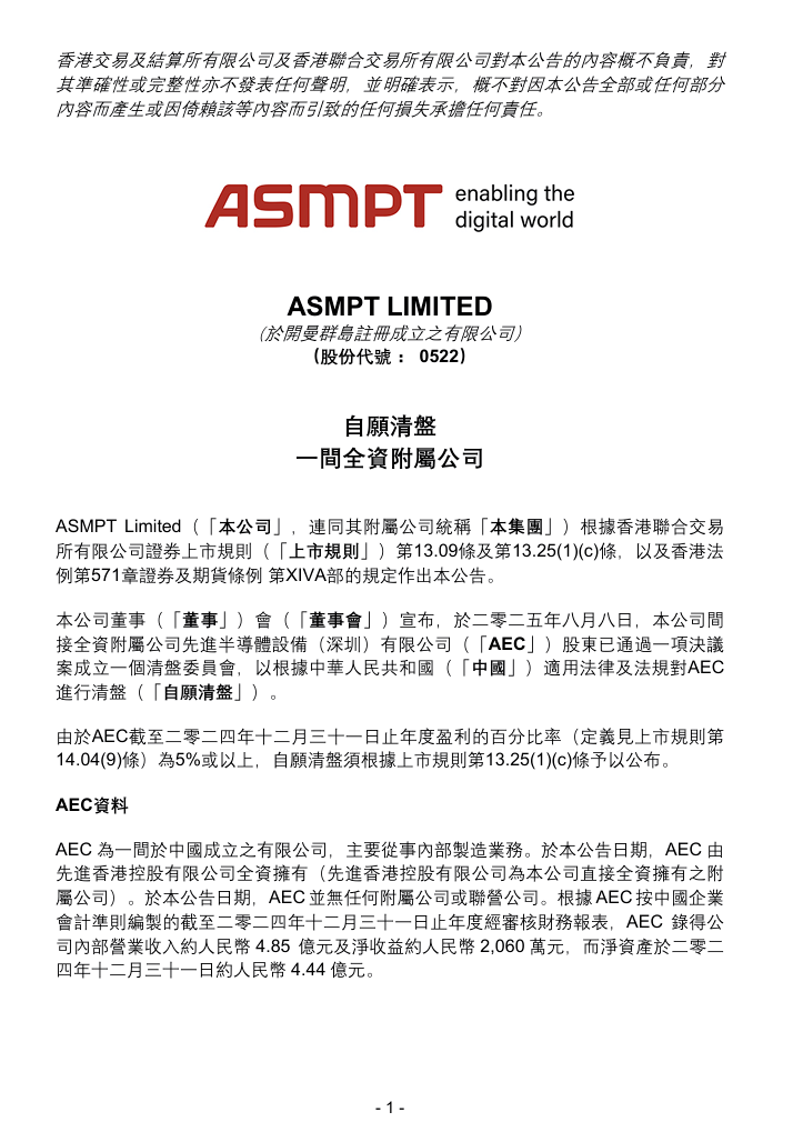ASMPT决定对AEC进行清盘,是为了优化本集团的全球供应链,使其更能配合不断发展的市场动态及客户需求。因此,董事会认为自愿清盘符合本公司及其股东的整体利益。