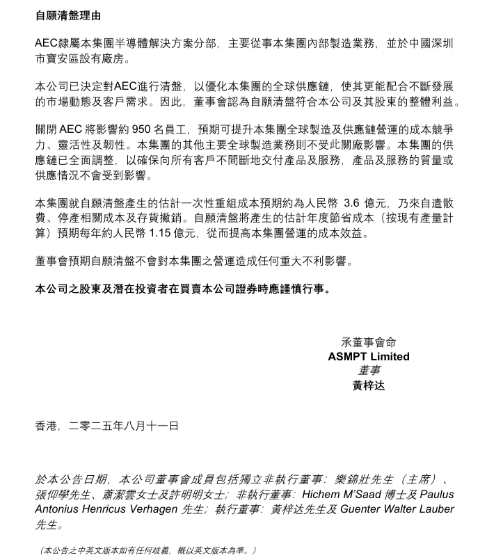 AEC公司发布的清盘通知ASMPT指出,关闭AEC将影响约950名员工,预期可提升本集团全球制造及供应链营运的成本竞争力、灵活性及韧性。本集团的其他主要全球制造业务则不受此关厂影响。本集团的供应链已全面调整,以确保向所有客户不间断地交付产品及服务,产品及服务的质量或供应情况不会受到影响。