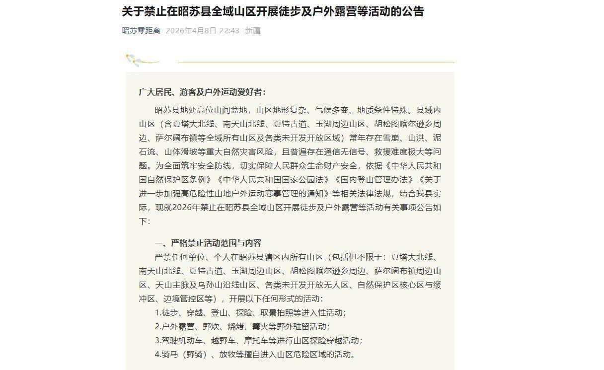 4月8日,昭苏县文化体育广播电视和旅游局公告称,昭苏县地处高位山间盆地,山区地形复杂、气候多变、地质条件特殊。县域内山区(含夏塔大北线、南天山北线、夏特古道、玉湖周边山区、胡松图喀尔逊乡周边、萨尔阔布镇等全域所有山区及各类未开发开放区域)常年存在雪崩、山洪、泥石流、山体滑坡等重大自然灾害风险,且普遍存在通信无信号、救援难度极大等问题。