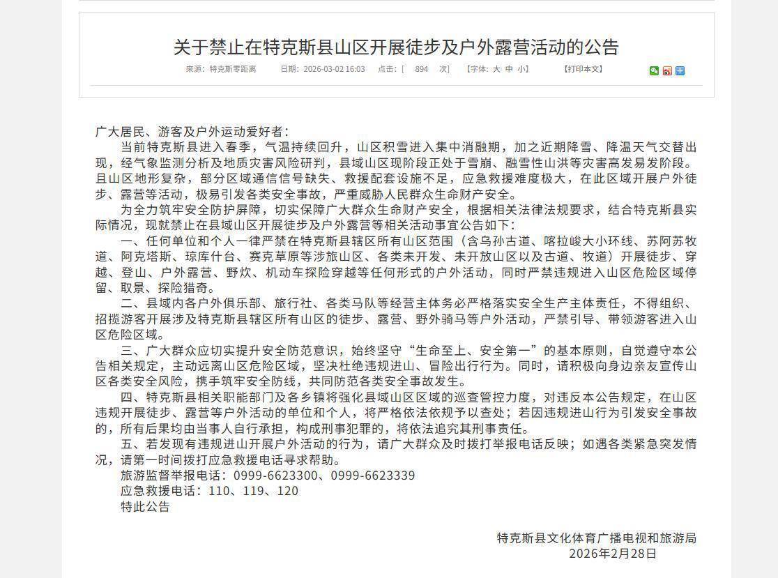 极目新闻记者注意到,在1个多月前,特克斯县也曾发布公告称,当前气温持续回升,山区积雪进入集中消融期,加之近期降雪、降温天气交替出现,经气象监测分析及地质灾害风险研判,县域山区现阶段正处于雪崩、融雪性山洪等灾害高发易发阶段。且山区地形复杂,部分区域通信信号缺失、救援配套设施不足,应急救援难度极大,在此区域开展户外徒步、露营等活动,极易引发各类安全事故,严重威胁人民群众生命财产安全。