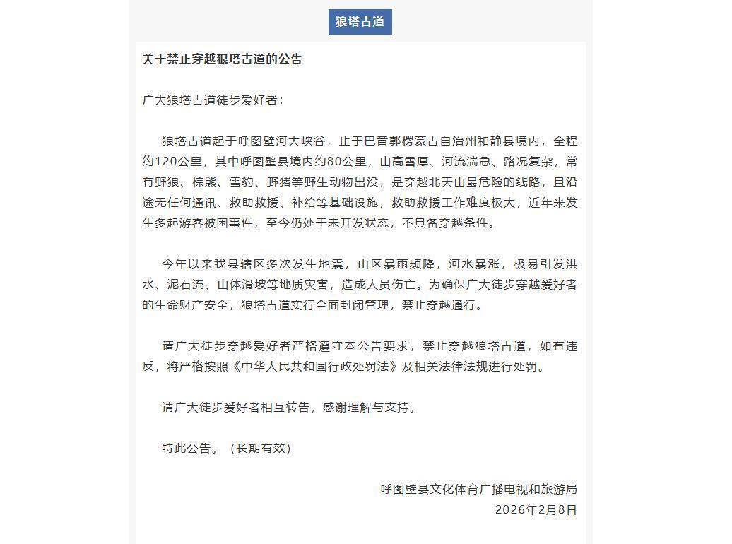 今年以来该县辖区多次发生地震,山区暴雨频降,河水暴涨,极易引发洪水、泥石流、山体滑坡等地质灾害,造成人员伤亡。为确保广大徒步穿越爱好者的生命财产安全,狼塔古道实行全面封闭管理,禁止穿越通行。请广大徒步穿越爱好者严格遵守本公告要求,禁止穿越狼塔古道,如有违反,将严格按照《中华人民共和国行政处罚法》及相关法律法规进行处罚。